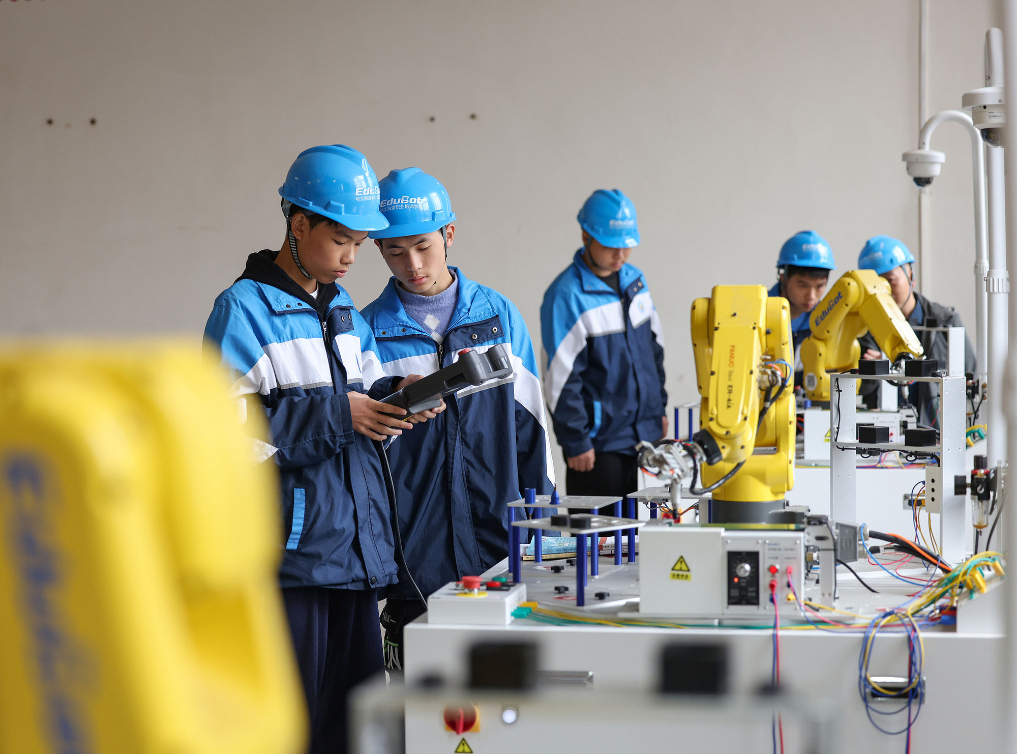 職業(yè)學(xué)校的學(xué)生在進(jìn)行工業(yè)機(jī)器人實(shí)操