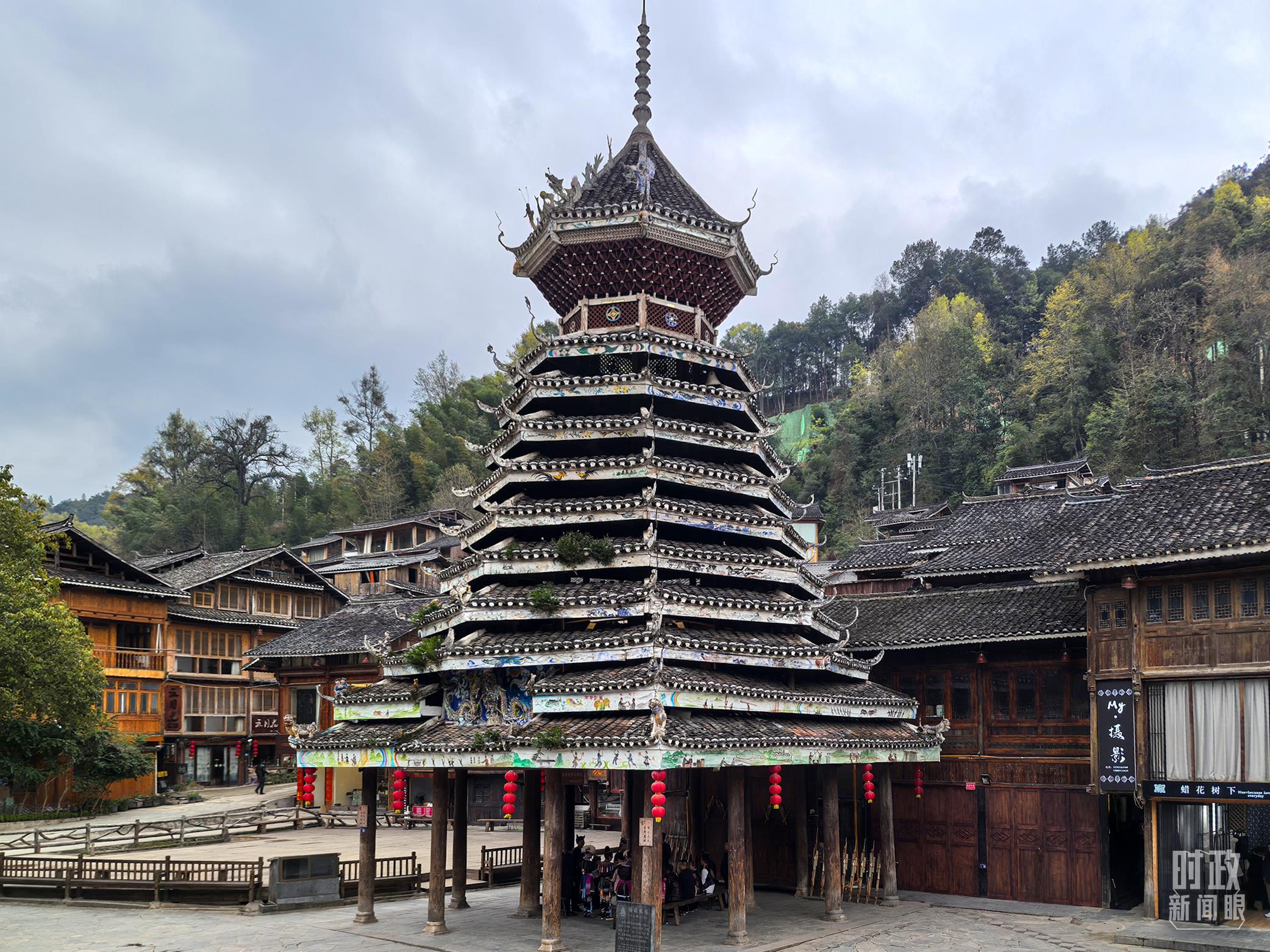 肇興侗寨以鼓樓群最為著名,五座鼓樓分別取名“仁團(tuán)鼓樓”“義團(tuán)鼓樓”“禮團(tuán)鼓樓”“智團(tuán)鼓樓”“信團(tuán)鼓樓”。圖中為信團(tuán)鼓樓。(總臺央視記者陸泓宇拍攝)