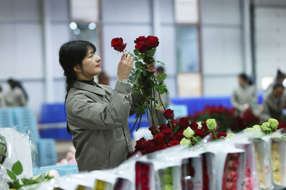 2017年2月14日,消費(fèi)者在云南省昆明市斗南花卉市場選購玫瑰花。