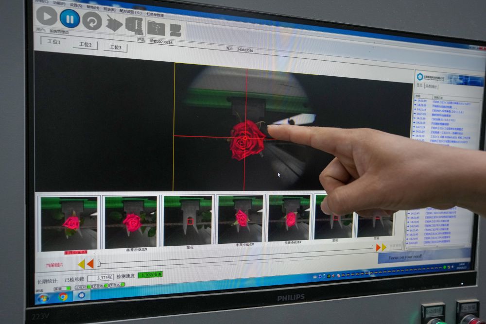 2024年8月23日,在云南晉寧花卉產(chǎn)業(yè)現(xiàn)代化示范園采后處理中心,計(jì)算機(jī)在實(shí)時(shí)監(jiān)測自動分揀流水線上的鮮切花。