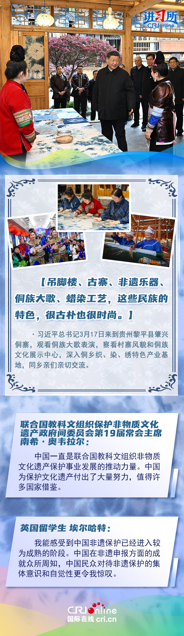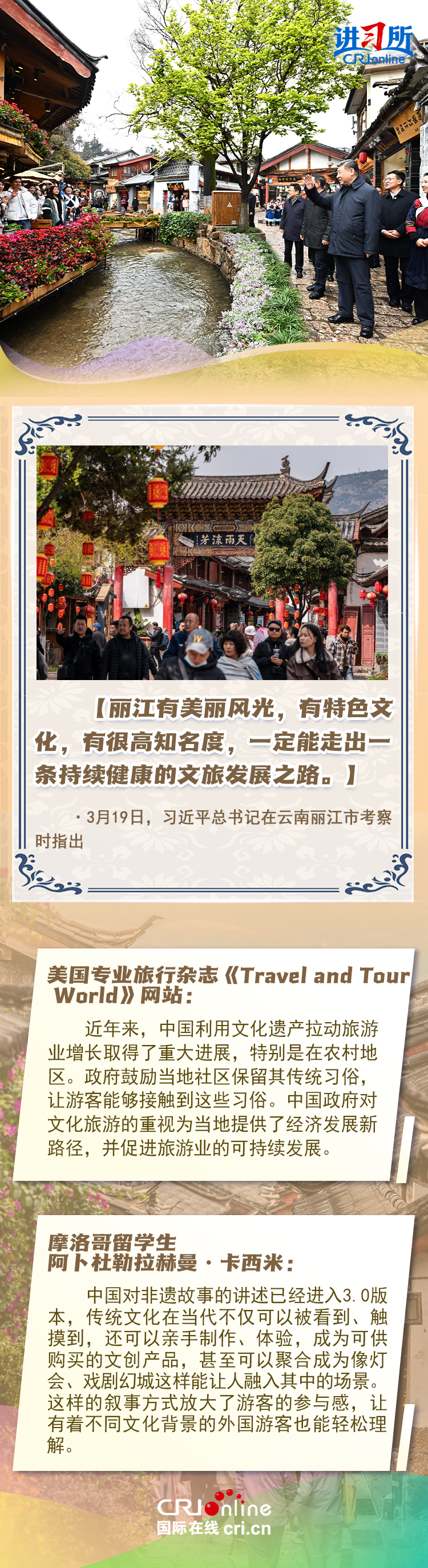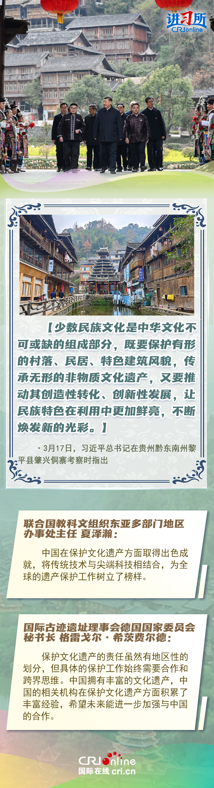 習(xí)近平總書記近日赴貴州、云南考察。他走進(jìn)民族特色村寨、歷史文化古城,心系歷史文化遺產(chǎn)保護(hù)和文旅融合發(fā)展。習(xí)近平特別叮囑當(dāng)?shù)毓賳T和群眾,既要保護(hù)有形的村落、民居、特色建筑風(fēng)貌,傳承無形的非物質(zhì)文化遺產(chǎn),又要推動其創(chuàng)造性轉(zhuǎn)化、創(chuàng)新性發(fā)展。