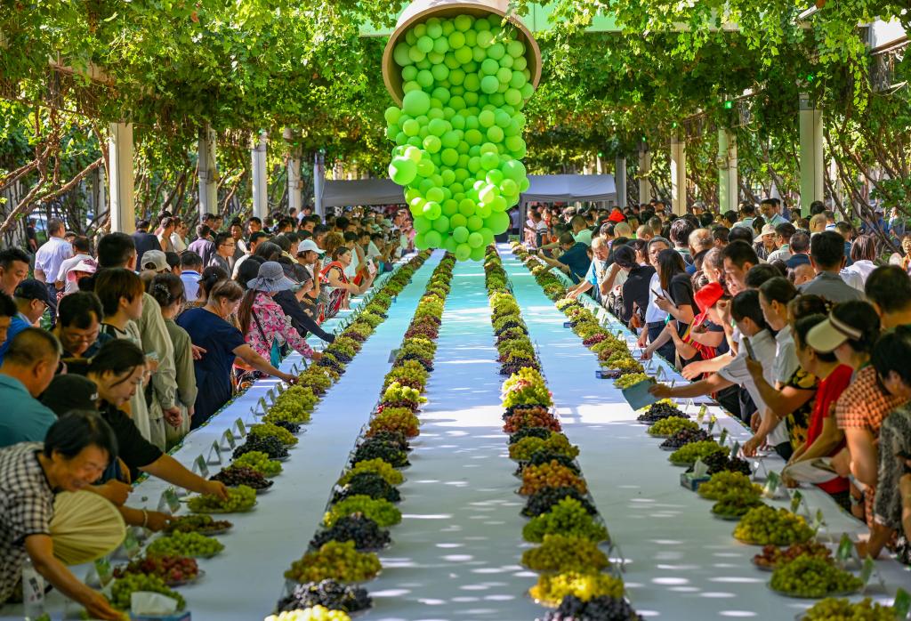 人們?cè)谕卖敺厣咸鸭猩掀穱L葡萄(2024年8月17日攝)。新華社記者 陳朔 攝