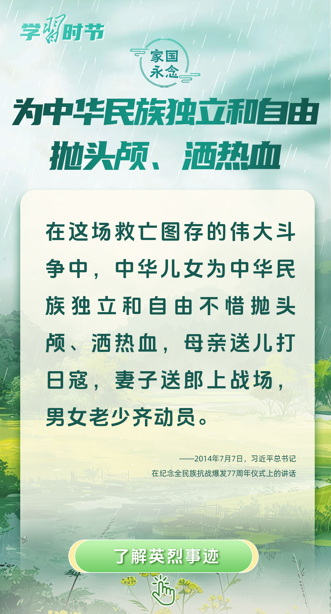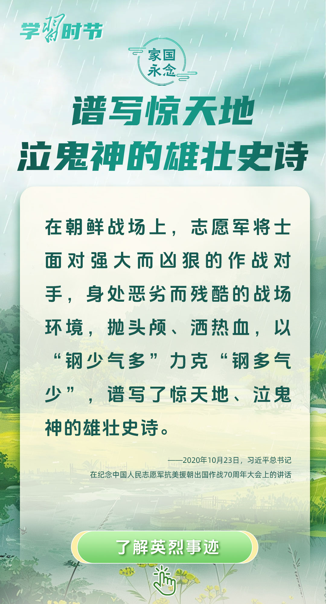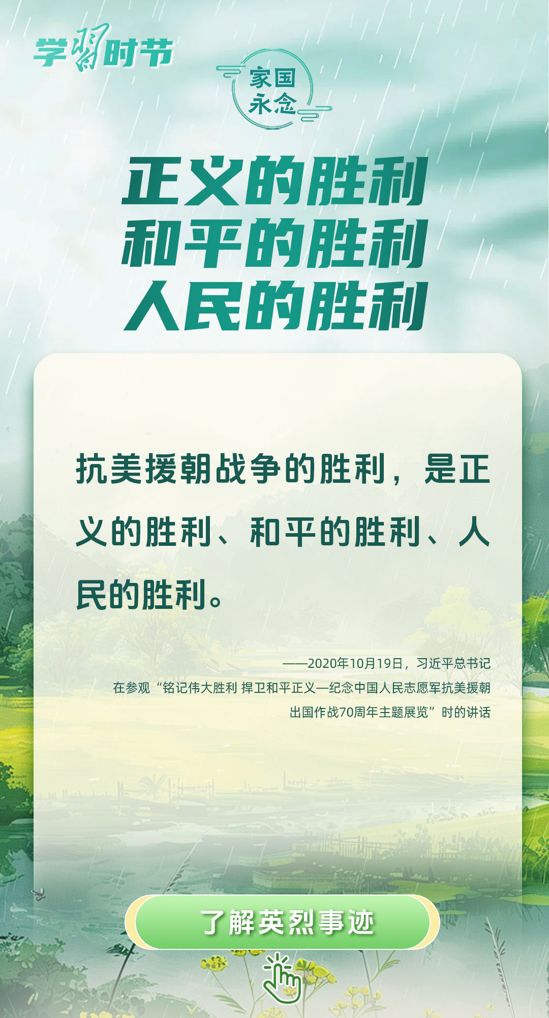 今年是中國(guó)人民抗日戰(zhàn)爭(zhēng)暨世界反法西斯戰(zhàn)爭(zhēng)勝利80周年、中國(guó)人民志愿軍抗美援朝出國(guó)作戰(zhàn)75周年。習(xí)近平總書記曾說:“對(duì)一切為國(guó)家、為民族、為和平付出寶貴生命的人們,不管時(shí)代怎樣變化,我們都要永遠(yuǎn)銘記他們的犧牲和奉獻(xiàn)。”今天我們所擁有的一切,無不凝結(jié)著英雄、英烈們的奉獻(xiàn)付出乃至巨大犧牲。