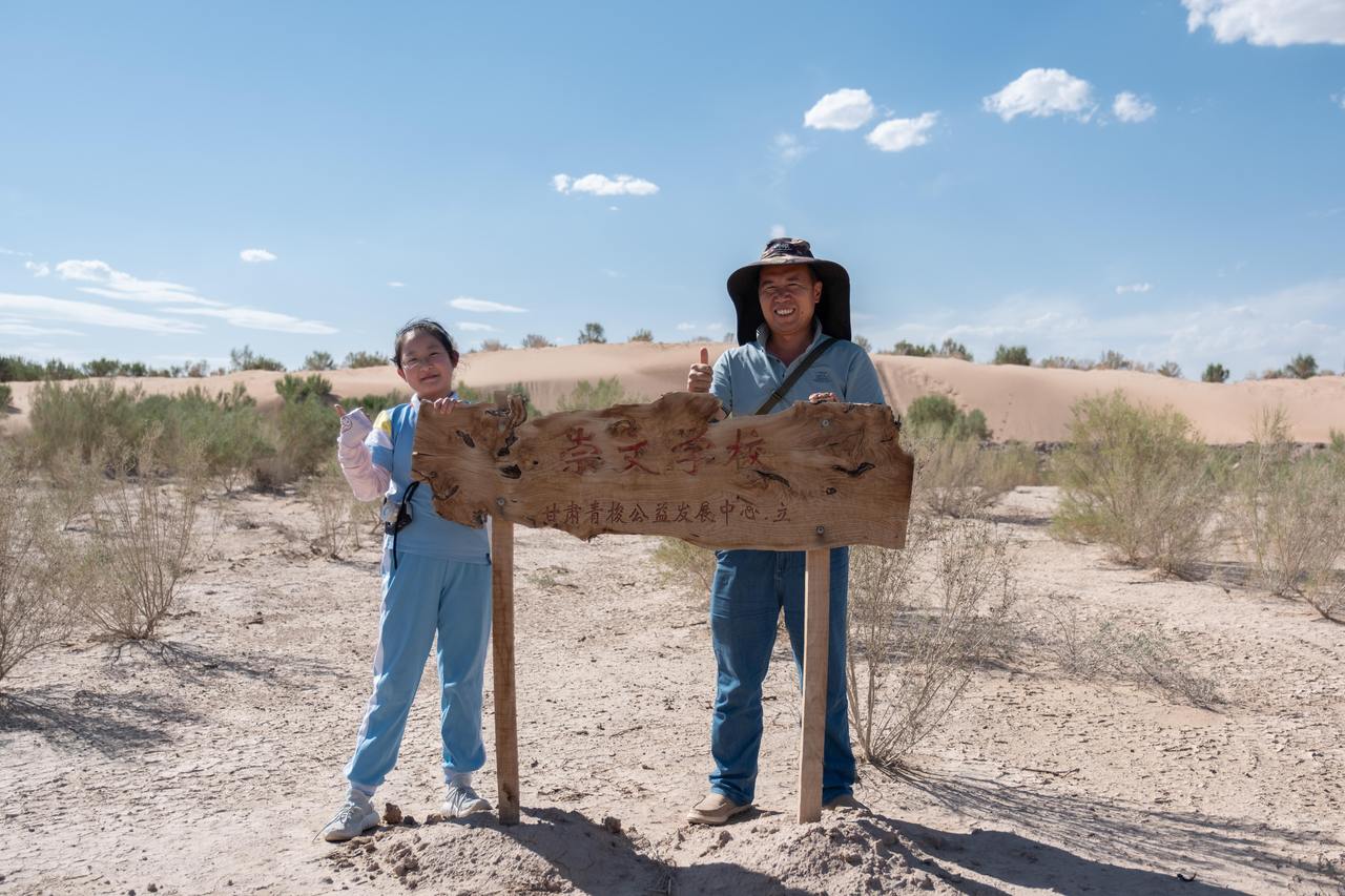 天地茫茫,站在“崇文林”的標(biāo)志旁,背后是巴丹吉林沙漠。前方的高山上,一座紀(jì)念碑高高佇立,上面書(shū)寫(xiě)著習(xí)近平總書(shū)記在甘肅視察時(shí)強(qiáng)調(diào)的“確保民勤不成為第二個(gè)羅布泊”。