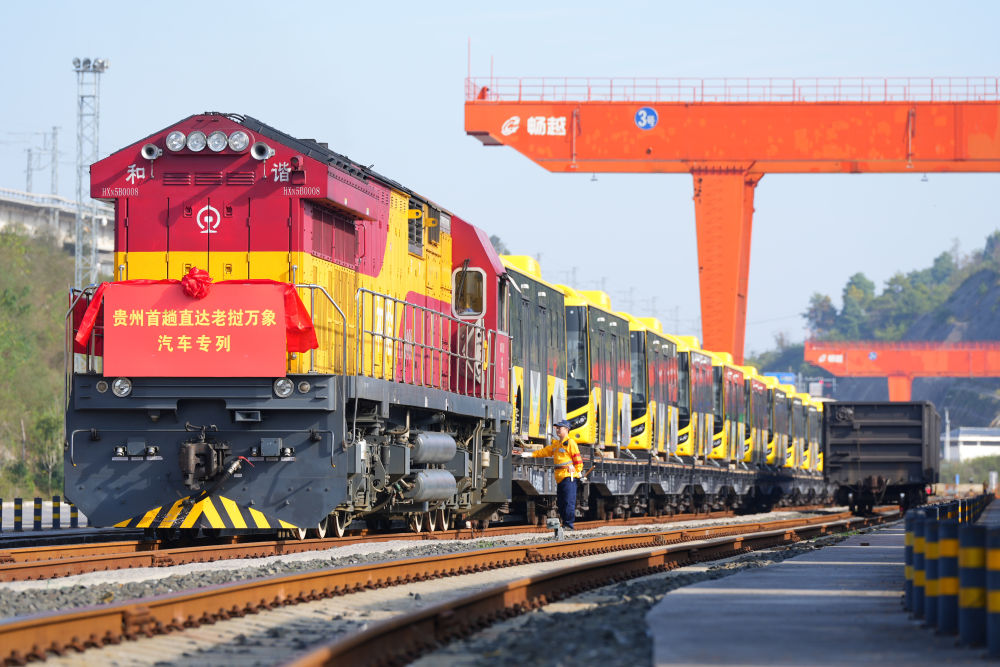 2024年10月28日,裝載著28輛“貴州造”新能源客車的出口專列停靠在貴陽國際陸港都拉營站,準備經(jīng)由云南磨憨口岸出境前往老撾萬象。這是貴州的中老班列首次整列直發(fā),也是貴州本土生產(chǎn)的新能源客車首次出口老撾。