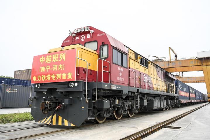 2024年3月8日,在廣西南寧國(guó)際鐵路港,電力鐵塔專列準(zhǔn)備發(fā)車。當(dāng)日,一列滿載340噸電力鐵塔的中越班列從南寧國(guó)際鐵路港開出,發(fā)往越南河內(nèi)。新華社記者 曹祎銘 攝