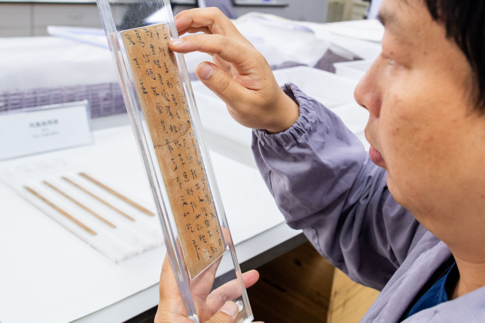 2023年5月20日,湖北荊州文物保護(hù)中心的修復(fù)人員史少華在查看修復(fù)完成的簡(jiǎn)牘。荊州文物保護(hù)中心是我國簡(jiǎn)牘修復(fù)領(lǐng)域?qū)嵙ψ顝?qiáng)的機(jī)構(gòu)之一,近年來累計(jì)完成13萬多枚竹木簡(jiǎn)牘的脫水工作,飽水簡(jiǎn)牘修復(fù)量占全國90%以上。