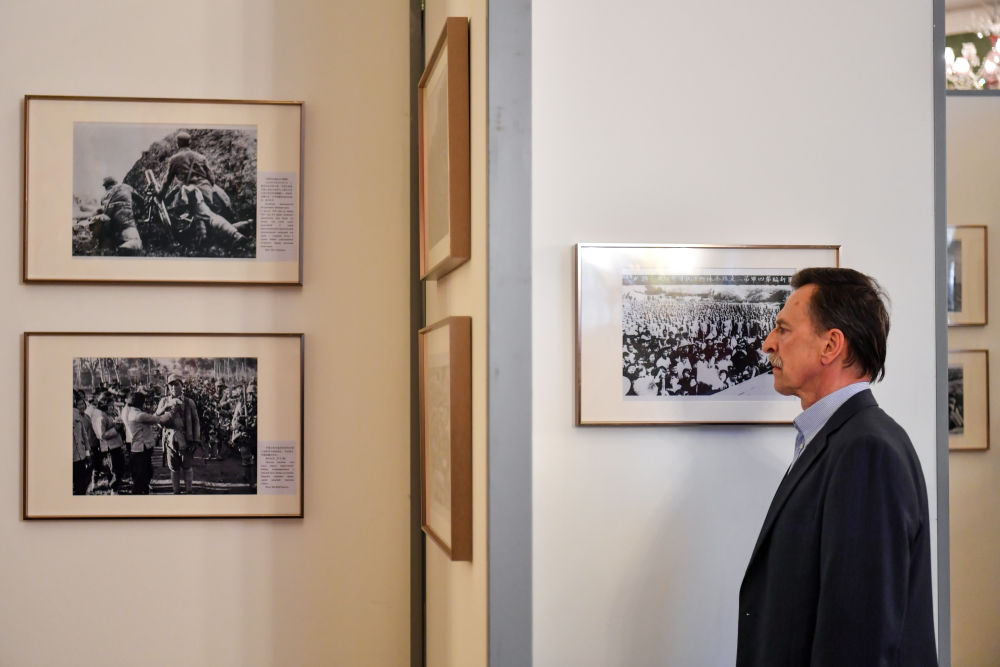 4月18日,在俄羅斯首都莫斯科,嘉賓參觀紀(jì)念中國人民抗日戰(zhàn)爭暨世界反法西斯戰(zhàn)爭勝利80周年圖片展。新華社記者 曹陽 攝