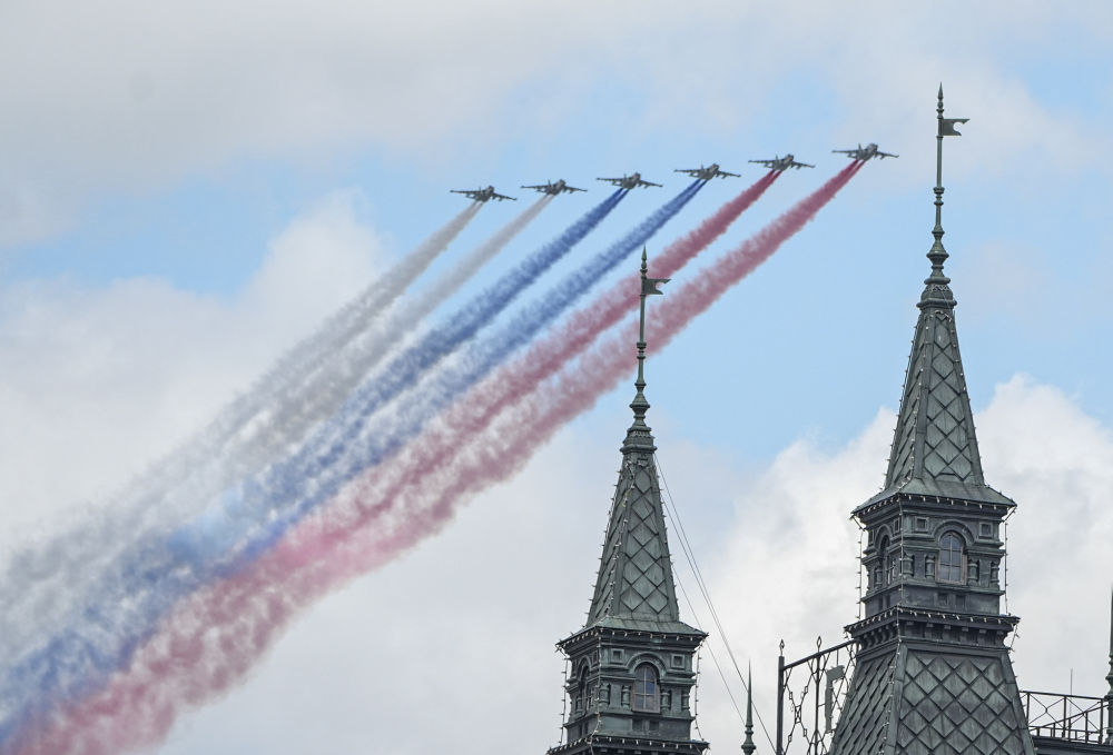 5月9日,在俄羅斯首都莫斯科,參加紀(jì)念蘇聯(lián)偉大衛(wèi)國(guó)戰(zhàn)爭(zhēng)勝利80周年閱兵式的戰(zhàn)機(jī)編隊(duì)拉煙飛行。新華社記者 賴向東 攝