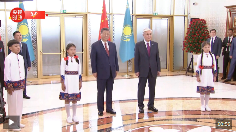 習近平抵達阿斯塔納納扎爾巴耶夫國際機場時,托卡耶夫總統(tǒng)率總統(tǒng)辦公廳主任達杰拜、副總理兼外長努爾特列烏、總統(tǒng)外事顧問卡濟漢、阿斯塔納市長卡瑟姆別克等高級官員熱情迎接。