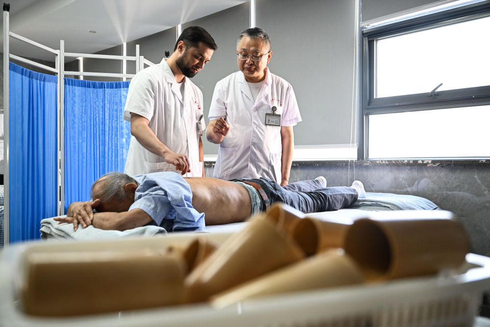 2025年4月18日,在南京中醫(yī)藥大學(xué)第二附屬醫(yī)院針灸康復(fù)科,李小龍(后左)在導(dǎo)師張建斌指導(dǎo)下給患者行針。南京中醫(yī)藥大學(xué)2023級針灸推拿專業(yè)的碩士研究生阿米爾中來自塔吉克斯坦首都杜尚別。中學(xué)時,他愛上了中國文化,給自己取了個中文名字“李小龍”。他刻苦學(xué)習(xí)中文,參加漢語橋中學(xué)生中文比賽,后來多次來到中國,與中醫(yī)結(jié)緣。2015年,李小龍到北京中醫(yī)藥大學(xué)學(xué)習(xí)針灸推拿,畢業(yè)后回到杜尚別開了自己的中醫(yī)診所。2023年,為了進一步提升自己,李小龍來到南京中醫(yī)藥大學(xué)攻讀碩士研究生?!敖窈螅蚁M阎嗅t(yī)帶到更多的國家,讓更多人感受中醫(yī)的妙處?!?/p>