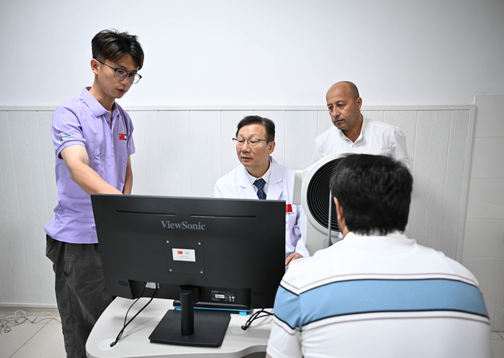 2025年5月31日,在塔吉克斯坦杜尚別,中國眼科專家黨光福(中)在防盲合作中心為當(dāng)?shù)厥忻褡鲅劭茩z查。當(dāng)日,“健康快車中塔防盲合作中心”在塔吉克斯坦首都杜尚別開始運營。該中心旨在加強中塔兩國眼科醫(yī)療合作,促進雙方眼科醫(yī)護人員互訪培訓(xùn)和學(xué)術(shù)交流,將惠及更多眼疾患者。