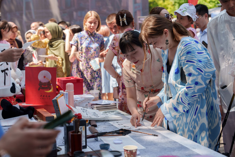 2025年4月19日,在哈薩克斯坦阿拉木圖,一名中國文化愛好者在“國際中文日”慶祝活動上體驗書法。