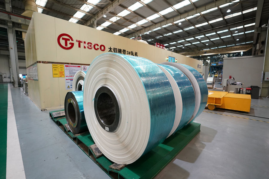 這是2023年10月24日拍攝的中國寶武山西太鋼不銹鋼精密帶鋼有限公司車間一角。一卷卷超薄“手撕鋼”產(chǎn)品擺放在車間內(nèi)。新華社記者 詹彥 攝