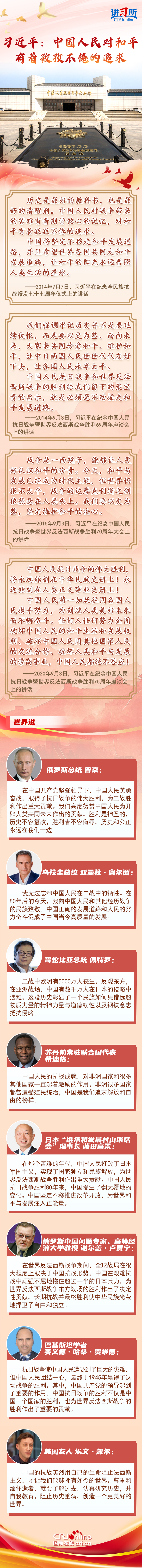 “中國(guó)人民抗日戰(zhàn)爭(zhēng)和世界反法西斯戰(zhàn)爭(zhēng)的勝利給我們留下的最寶貴的啟示,就是必須毫不動(dòng)搖走和平發(fā)展道路。”作為世界上唯一將和平發(fā)展寫入憲法和執(zhí)政黨黨章、上升為國(guó)家意志的大國(guó),中國(guó)始終從歷史中汲取智慧和力量,堅(jiān)定捍衛(wèi)來(lái)之不易的勝利成果。在國(guó)際友好人士眼中,中國(guó)為世界反法西斯戰(zhàn)爭(zhēng)東方戰(zhàn)場(chǎng)的勝利作出了決定性貢獻(xiàn),中國(guó)正確的發(fā)展道路和人民的努力奮斗促成了中國(guó)當(dāng)今高質(zhì)量的發(fā)展,為世界和平與發(fā)展注入正能量。