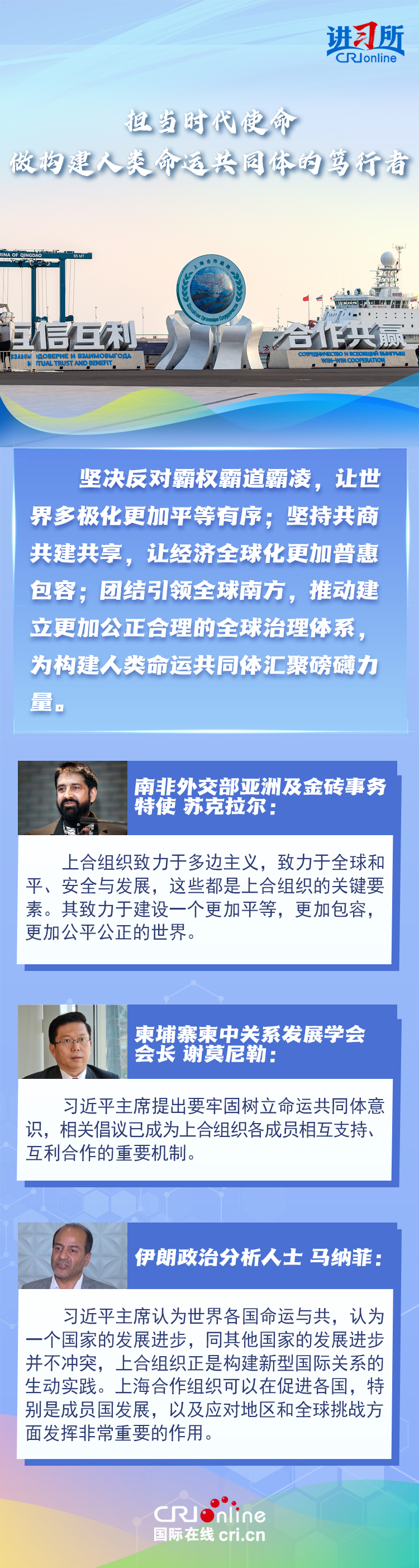 “讓‘上海精神’持續(xù)照亮構(gòu)建上海合作組織命運共同體之路?!鄙虾:献鹘M織成立24年來,始終秉持“上海精神”,成功走出了一條順應(yīng)時代潮流、契合各方需求的區(qū)域合作道路,樹立起新型國際關(guān)系的典范。在國際人士眼中,上海合作組織站在歷史正確一邊,致力于建設(shè)一個更加平等,更加包容,更加公平公正的世界,對維護(hù)地區(qū)和全球和平至關(guān)重要。