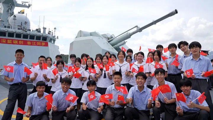 2025年7月3日,中國海軍山東艦航母編隊(duì)抵達(dá)香港。香港中學(xué)生登上海軍運(yùn)城艦參觀、留影。