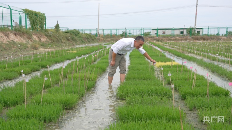 王仕明觀察不同品種水稻的生長情況(央廣網(wǎng)記者 索迪 攝)