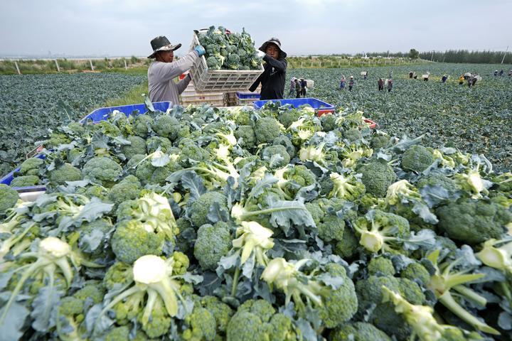 2025年7月18日,工作人員在寧夏固原市原州區(qū)彭堡鎮(zhèn)萬畝冷涼蔬菜基地運輸西蘭花。固原依托高海拔、氣候冷涼等“冷資源”優(yōu)勢,大力發(fā)展冷涼蔬菜產(chǎn)業(yè),著力打造“六盤山冷涼蔬菜”區(qū)域公用品牌。目前已建成冷涼蔬菜規(guī)模化種植基地130余個,種植面積穩(wěn)定在50萬畝,年產(chǎn)鮮菜200萬噸以上?!傲P山冷涼蔬菜”這張打造的“綠色名片”,已成為當?shù)剜l(xiāng)村振興發(fā)展之路上的“熱產(chǎn)業(yè)”