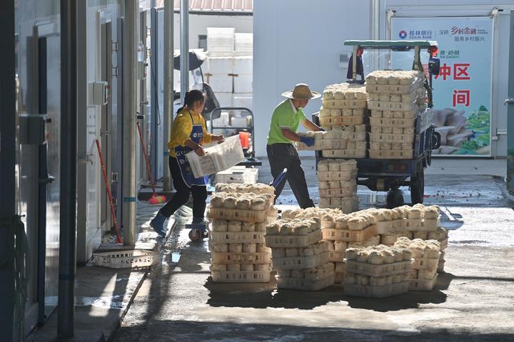 2024年10月31日,村民在廣西百色市德??h那造村食用菌生產(chǎn)基地搬運采摘的蘑菇。那造村通過做優(yōu)特色產(chǎn)業(yè)、豐富村民生活、完善基礎設施等多項具體舉措,推動各項事業(yè)快速發(fā)展。
