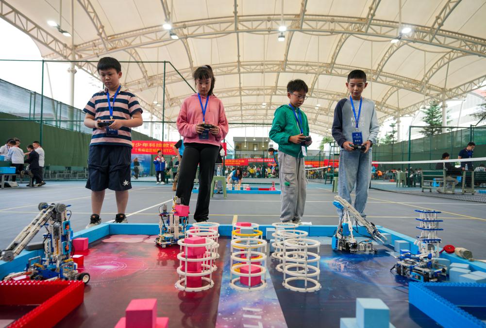 5月31日,四名參賽選手在全國青少年科技教育成果展示大賽云南省區(qū)域賽上操作機器人進(jìn)行比賽。新華社記者 陳欣波 攝