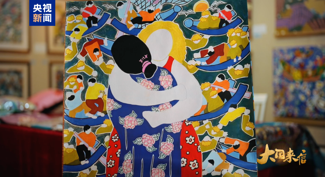 吳小飛也回贈(zèng)了一件禮物。由于她是一名漁民畫創(chuàng)作者,于是就把一幅名為《擁抱》的作品創(chuàng)作出來(lái)送給了對(duì)方。在她看來(lái),這不但是她們兩個(gè)人的擁抱,也是國(guó)和國(guó)的擁抱。