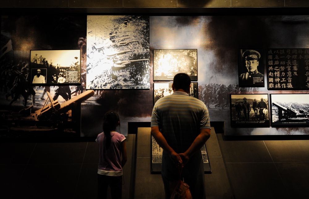 2013年8月15日,吉林省長春市各界人士來到位于偽滿皇宮博物院內(nèi)的東北淪陷史紀(jì)念館,參觀日本侵略中國東北史實(shí)展覽,緬懷抗戰(zhàn)英烈。這是一對父女在參觀展覽。