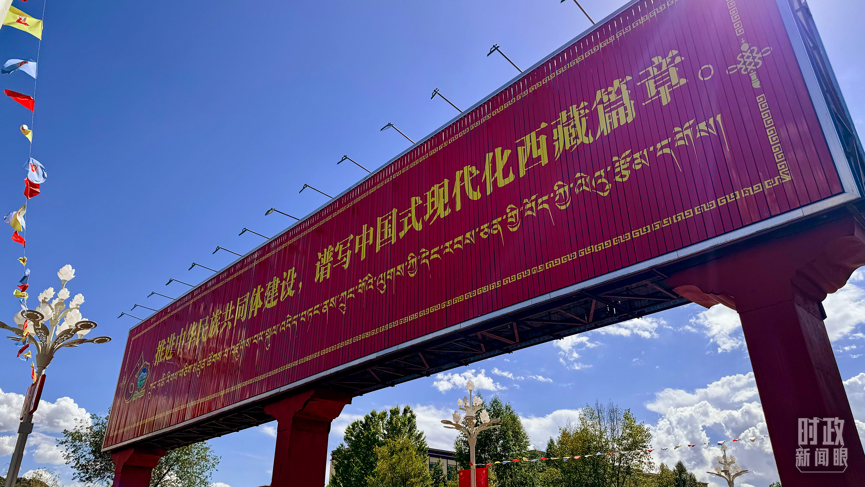 西藏自治區(qū)成立60周年標(biāo)語牌。(總臺央視記者張宇拍攝)