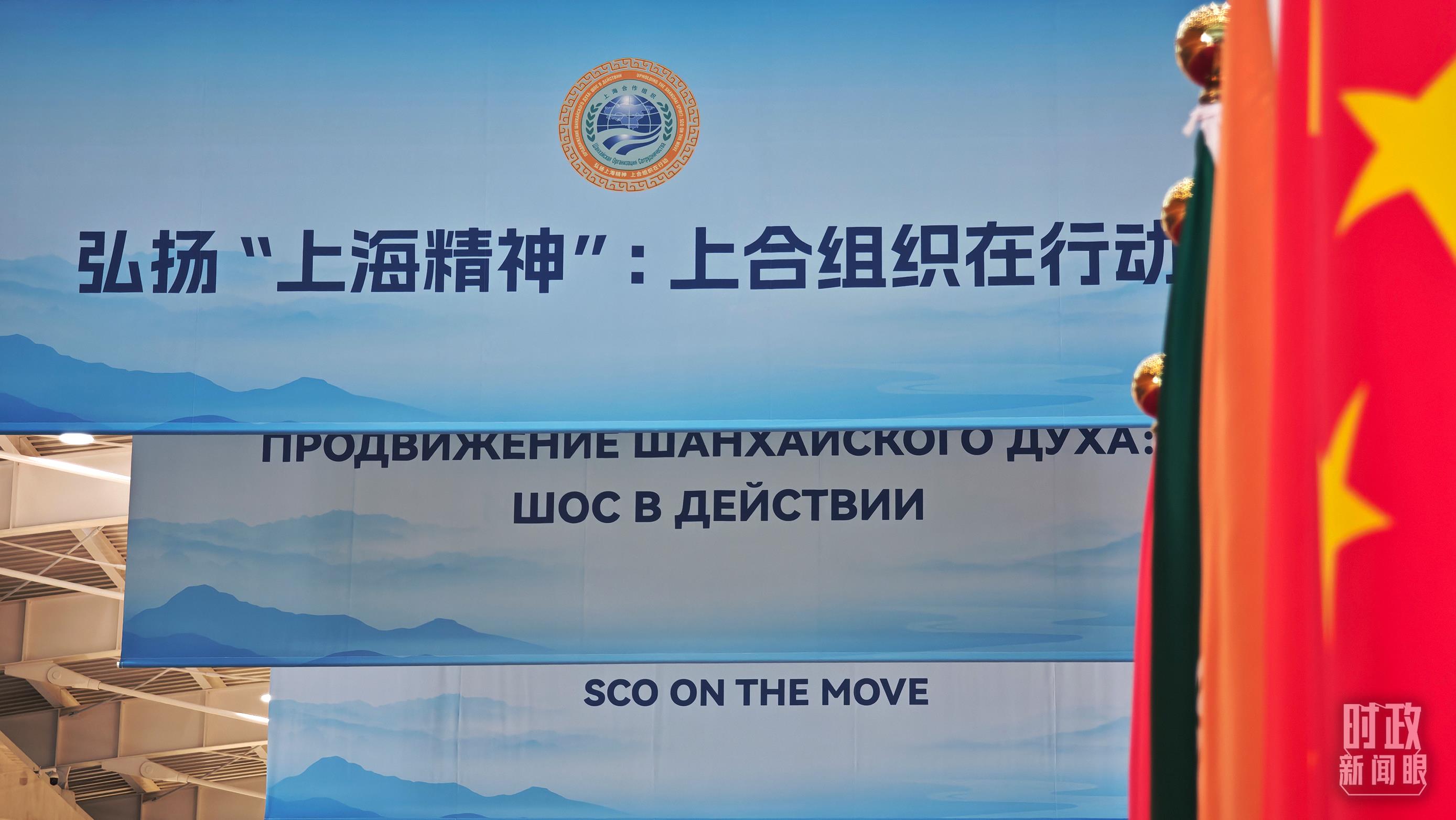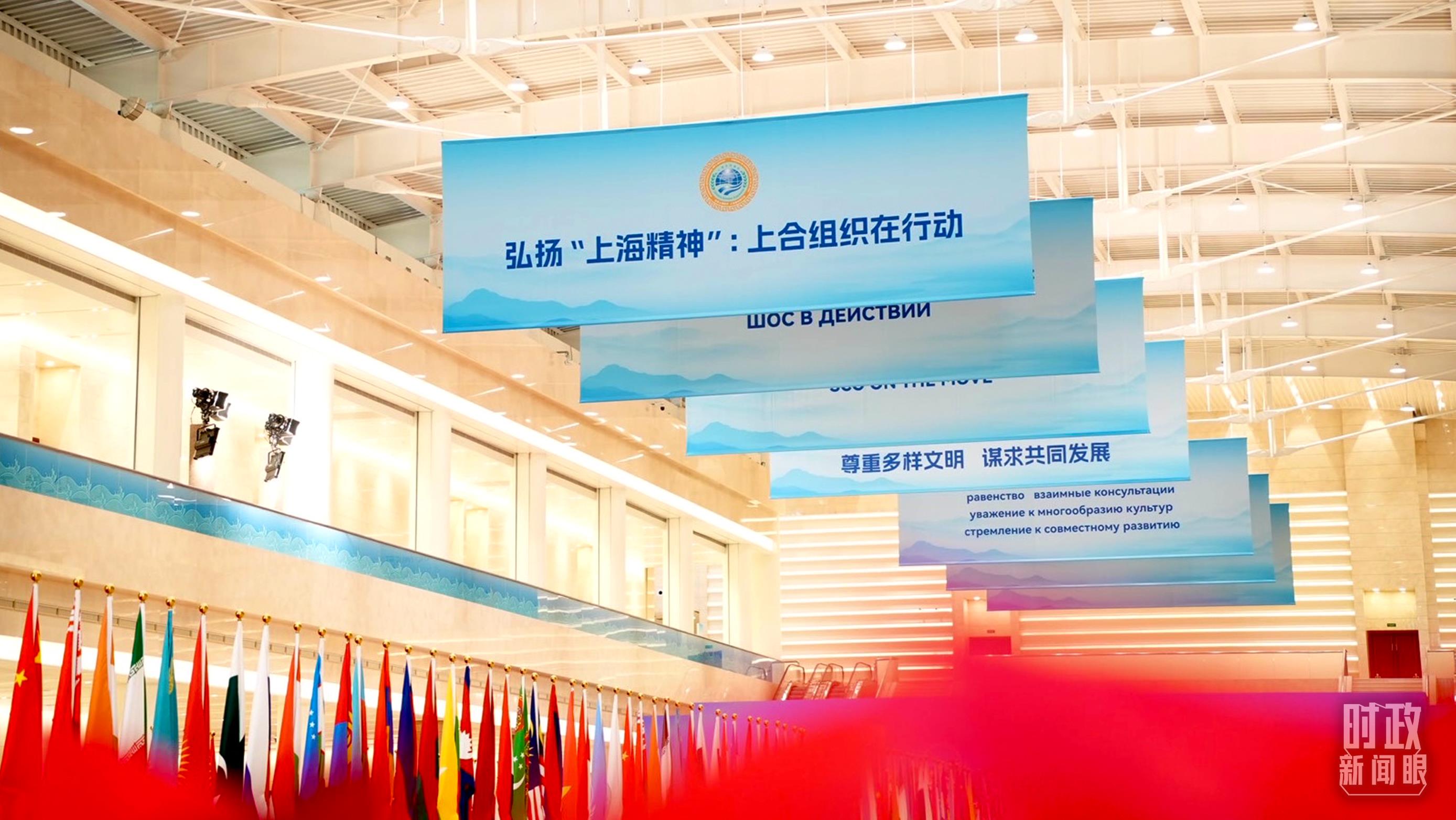 與會(huì)各國(guó)國(guó)旗、上合組織會(huì)旗和聯(lián)合國(guó)旗幟組成的恢弘旗陣。(總臺(tái)央視記者劉琦拍攝)