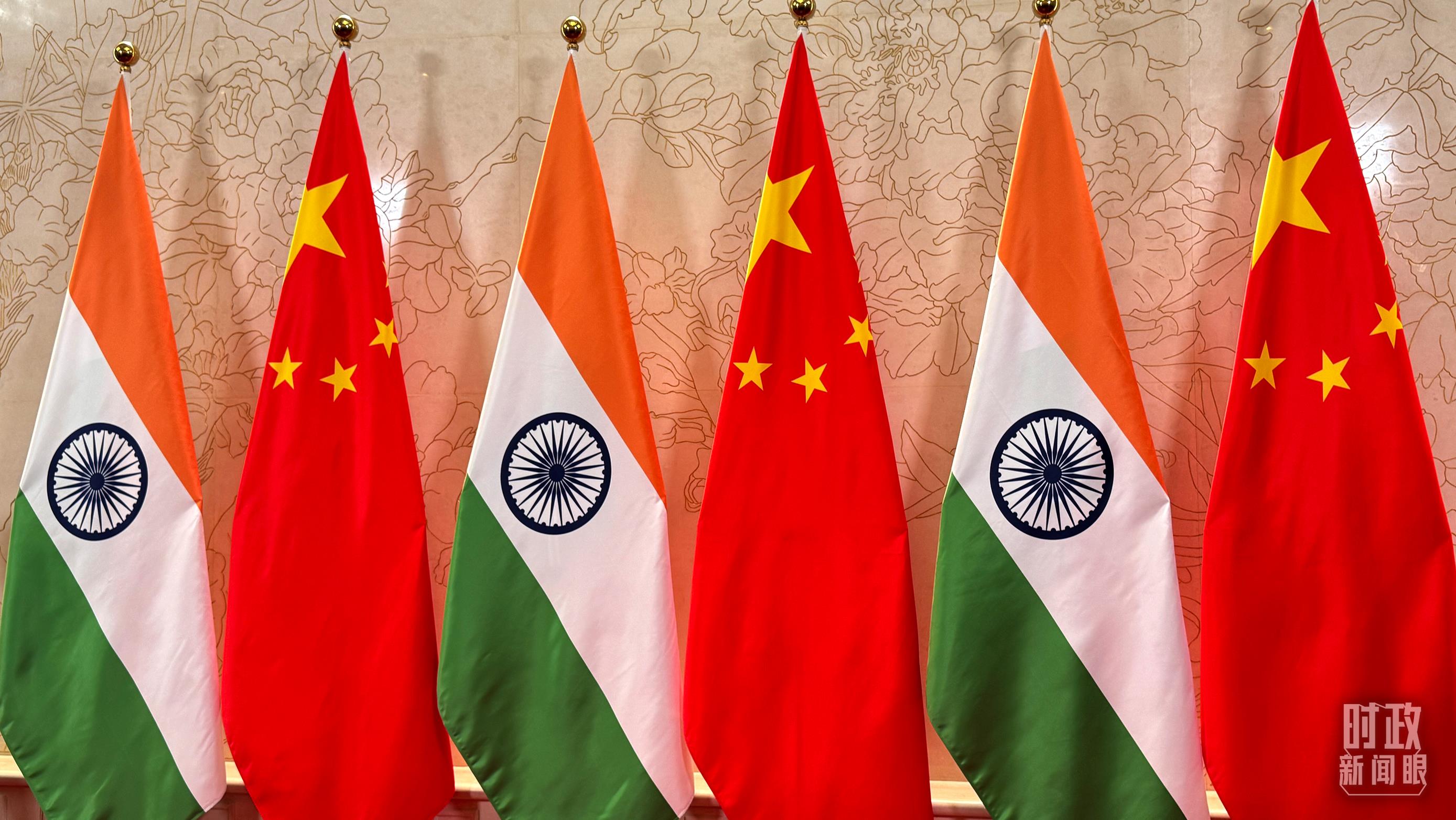 會(huì)見廳外擺放的中印兩國(guó)國(guó)旗。(總臺(tái)央視記者蔣碩拍攝)