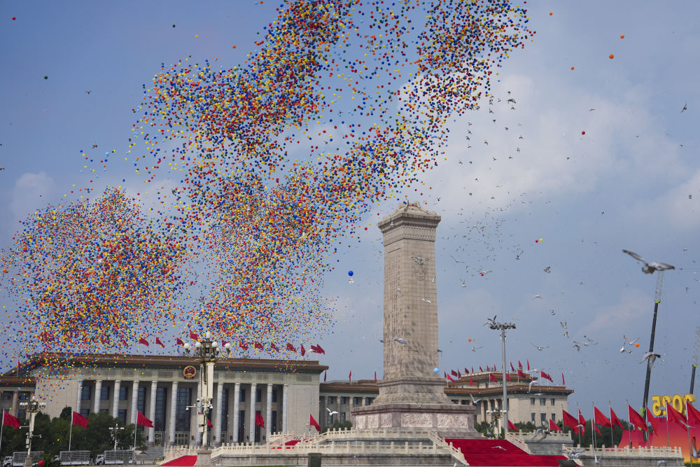 2025年9月3日,紀(jì)念中國人民抗日戰(zhàn)爭暨世界反法西斯戰(zhàn)爭勝利80周年大會(huì)在北京隆重舉行。這是紀(jì)念大會(huì)現(xiàn)場放飛氣球和鴿子。新華社記者 牟宇 攝
