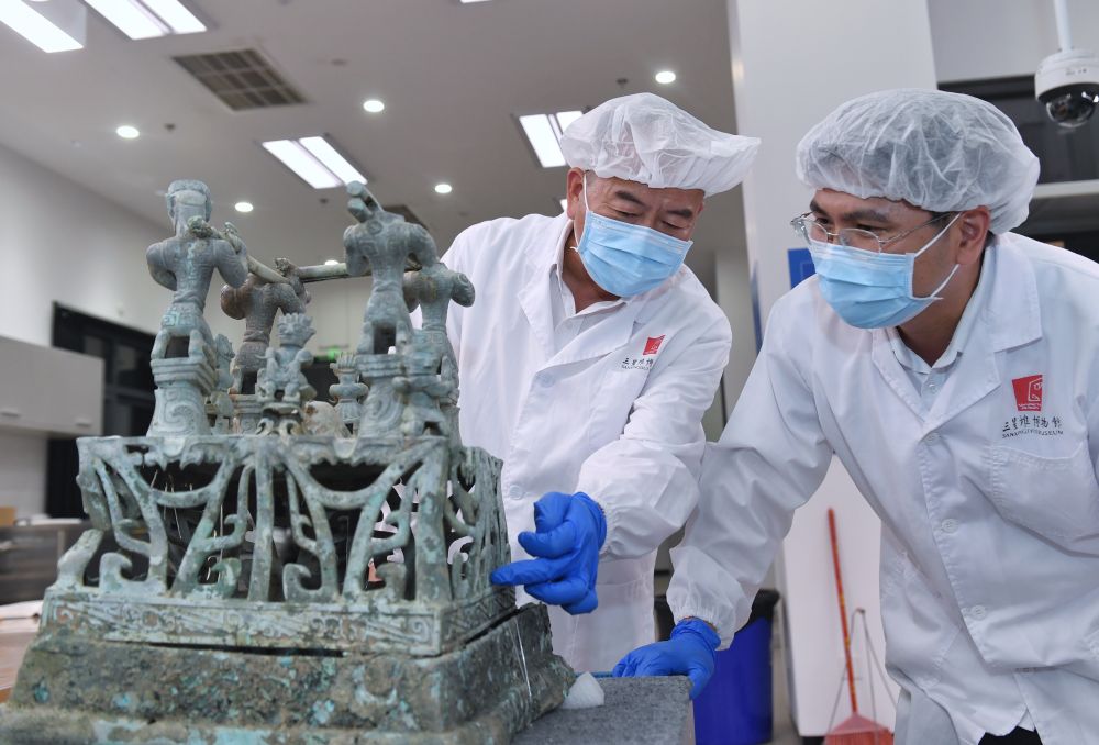 2023年5月30日,在四川三星堆博物館文物保護和修復(fù)中心,文物修復(fù)師郭漢中(左)與同事討論神壇底座修復(fù)方案。郭漢中從事文物修復(fù)工作已40余年,深度參與了三星堆祭祀坑的發(fā)掘工作,累計修復(fù)文物6000余件。“大概還有上萬件文物等著修復(fù),需要一代接著一代往下干。”郭漢中說,他要把平生所學(xué)傳承下去,培養(yǎng)更多人才。