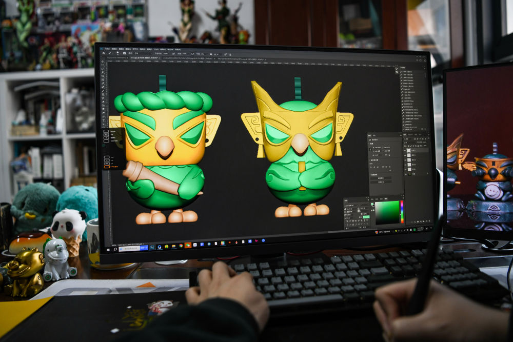 2025年3月1日,文創(chuàng)產(chǎn)品策劃運營師曾舟在位于四川成都的辦公室內(nèi)完善文創(chuàng)產(chǎn)品細節(jié)。他以三星堆青銅神樹、青銅縱目面具、青銅獸面等文物為創(chuàng)作藍本,結(jié)合潮玩元素設(shè)計的文創(chuàng)作品廣受歡迎?!拔蚁胱龅牟皇峭婢呖煜?,而是有內(nèi)容、有溫度、有意義的文化IP,讓年輕一代隨手摸到沉淀千年的文化?!痹壅f。