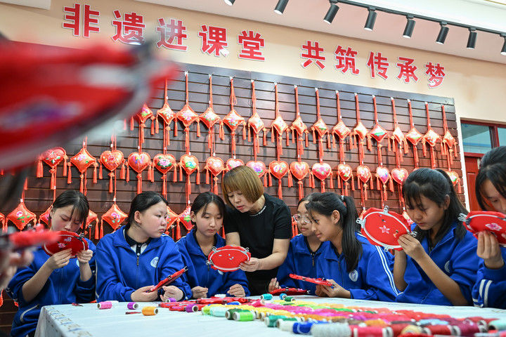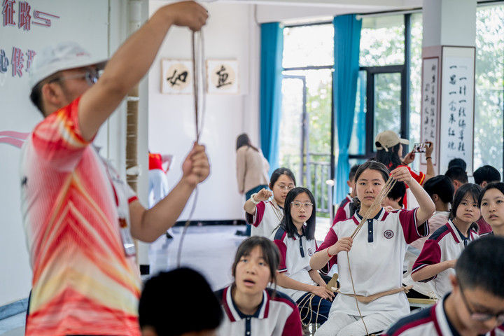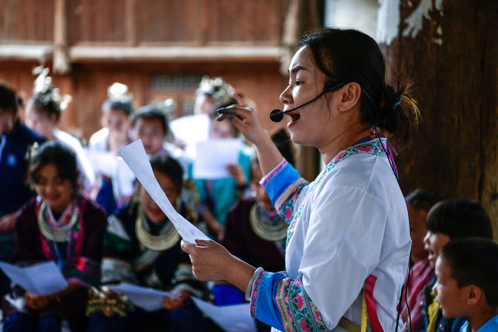 2025年9月26日,內(nèi)蒙古興安盟科右中旗巴彥呼舒第六中學(xué)美術(shù)教師、非遺代表性傳承人吳斯琴(左四)指導(dǎo)學(xué)生刺繡。近年來,內(nèi)蒙古興安盟科爾沁右翼中旗巴彥呼舒第六中學(xué)將當(dāng)?shù)貒壹?jí)非遺圖什業(yè)圖刺繡引入校園,開設(shè)校本課程,并成立興趣社團(tuán),在豐富校園文化生活的同時(shí),讓學(xué)生們近距離感受非遺的魅力,弘揚(yáng)和傳承中華優(yōu)秀傳統(tǒng)文化。隨著國產(chǎn)動(dòng)畫電影《哪吒之魔童鬧?!凡粩嗨⑿轮袊笆菲狈考o(jì)錄,參與電影配樂的貴州省榕江縣三寶侗寨的楊想妮和“舞樂蟬歌”團(tuán)隊(duì)為更多人所熟知。樂團(tuán)成員懷揣“用音樂傳遞侗族文化,讓世界聽見侗族大歌”的共同夢(mèng)想,將侗族大歌推向更廣闊的舞臺(tái)。這是2025年4月22日,楊想妮在貴州省黎平縣肇興鎮(zhèn)廈格侗寨教前來研學(xué)的孩子們唱侗歌。