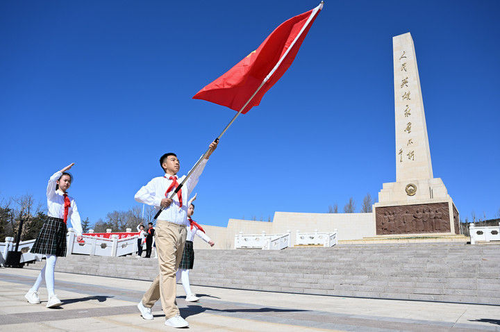 這是2025年4月2日在內(nèi)蒙古呼和浩特市大青山紅色文化公園拍攝的中國少年先鋒隊(duì)出旗儀式。