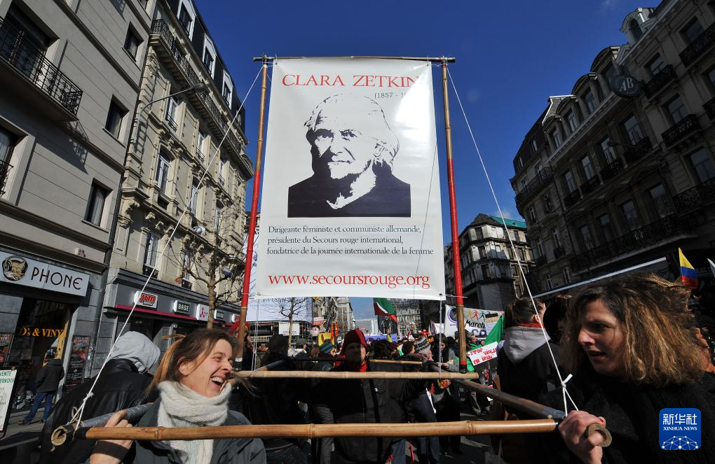 2010年3月6日,在比利時(shí)首都布魯塞爾,婦女代表抬著著名女政治活動(dòng)家、三八國(guó)際婦女節(jié)的倡導(dǎo)者克拉拉·蔡特金的畫(huà)像參加慶祝三八國(guó)際勞動(dòng)?jì)D女節(jié)游行。新華社記者 武巍 攝