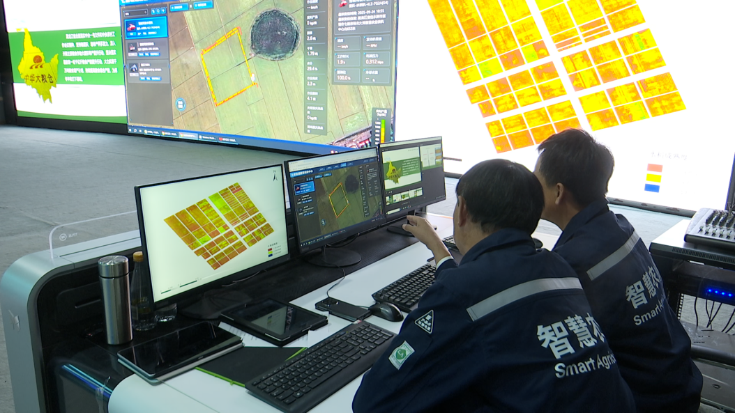 工作人員通過智慧農(nóng)業(yè)數(shù)字指揮平臺(tái)研判水稻成熟度(央廣網(wǎng)發(fā) 李延生 攝)