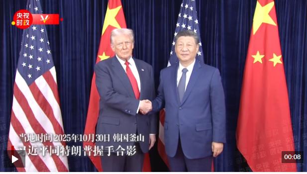 當?shù)貢r間10月30日中午,中美元首會晤開始前,習近平同特朗普握手合影。