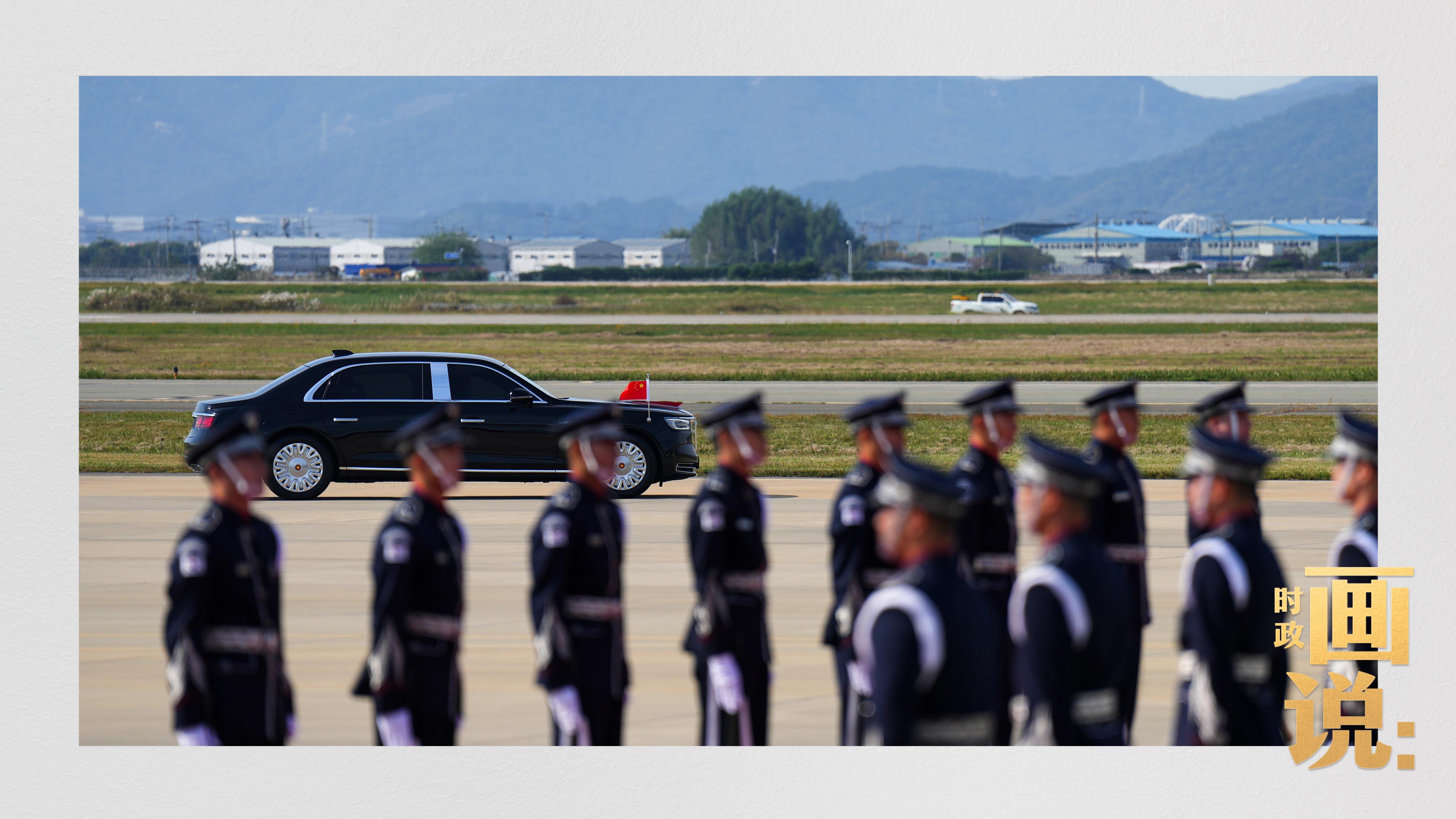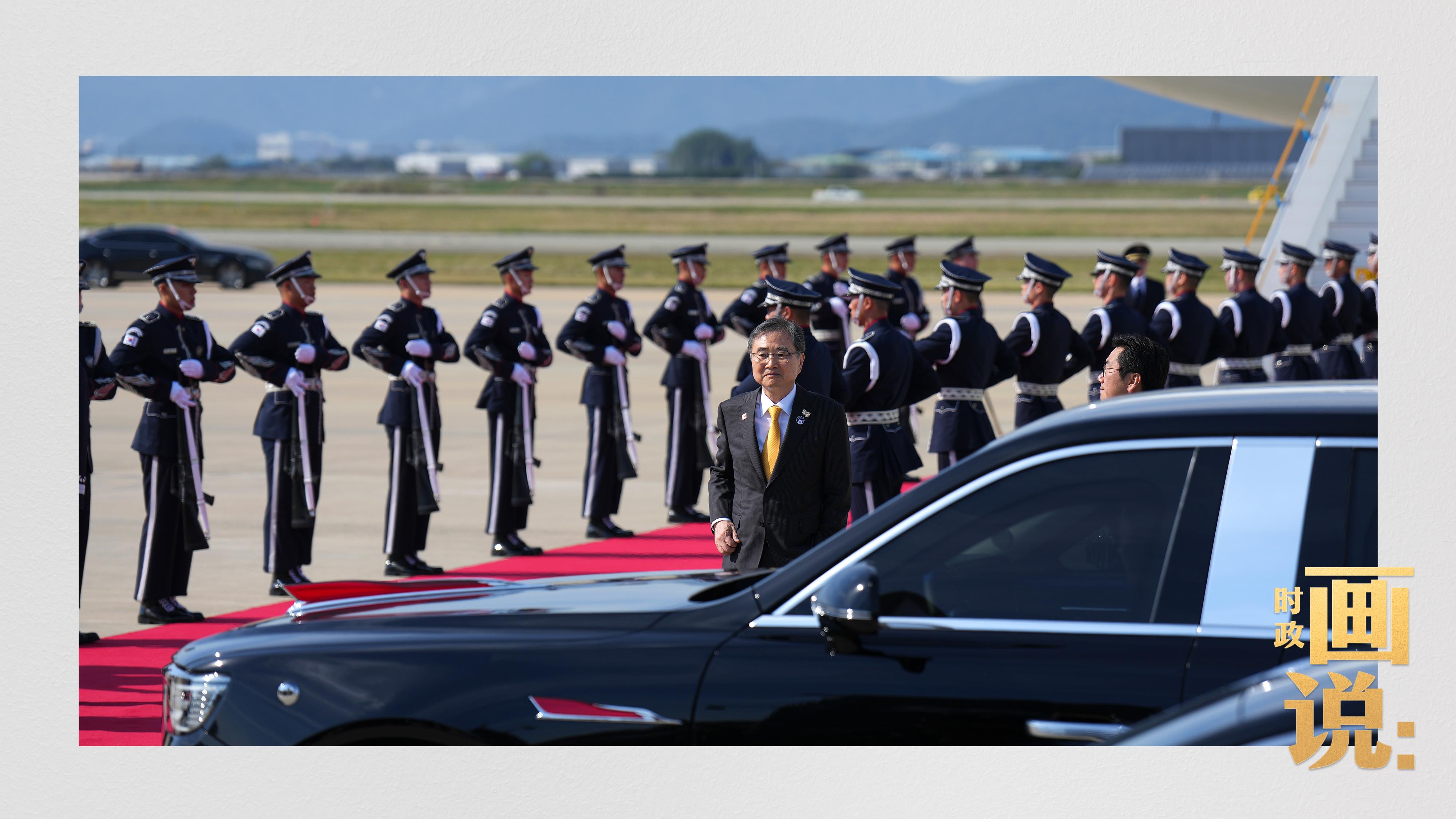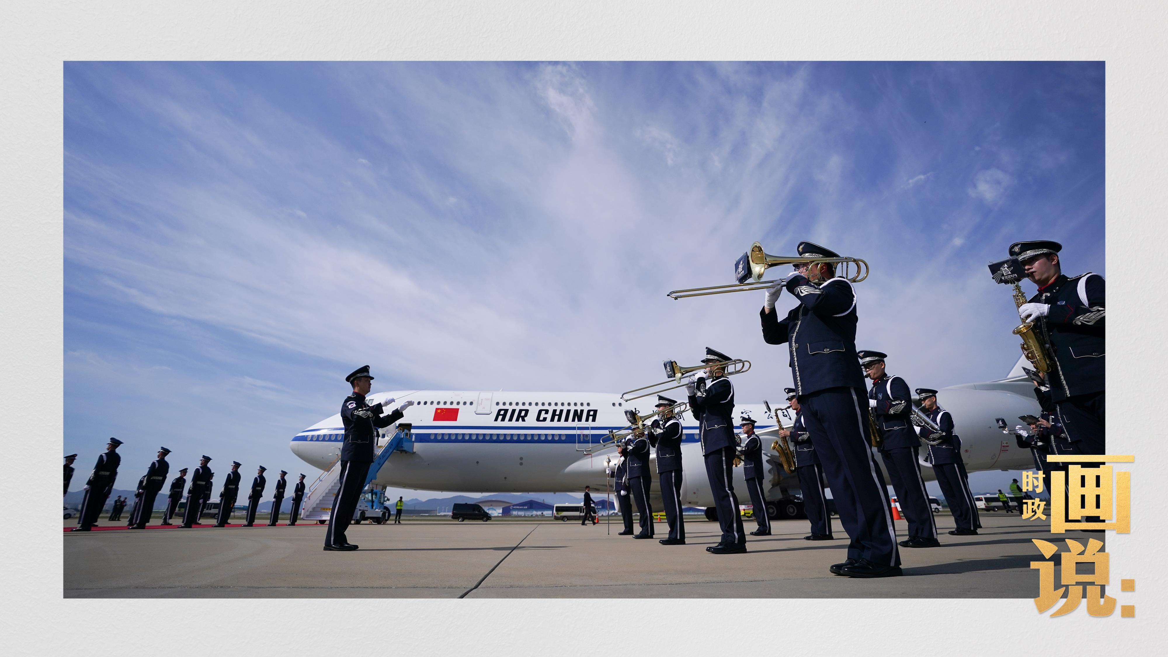 習近平抵達釜山金海國際機場時,韓國外長趙顯等高級官員熱情迎接。禮兵分列紅地毯兩側(cè)致敬,軍樂團演奏行進樂,機場鳴放21響禮炮。
