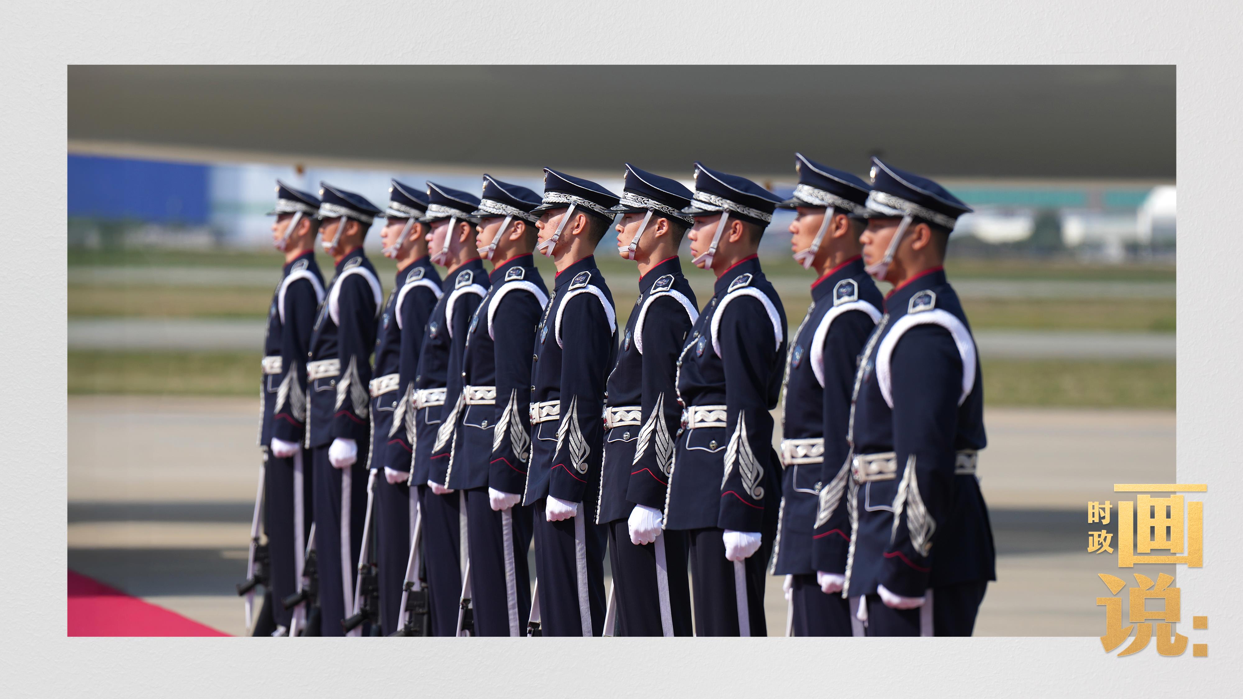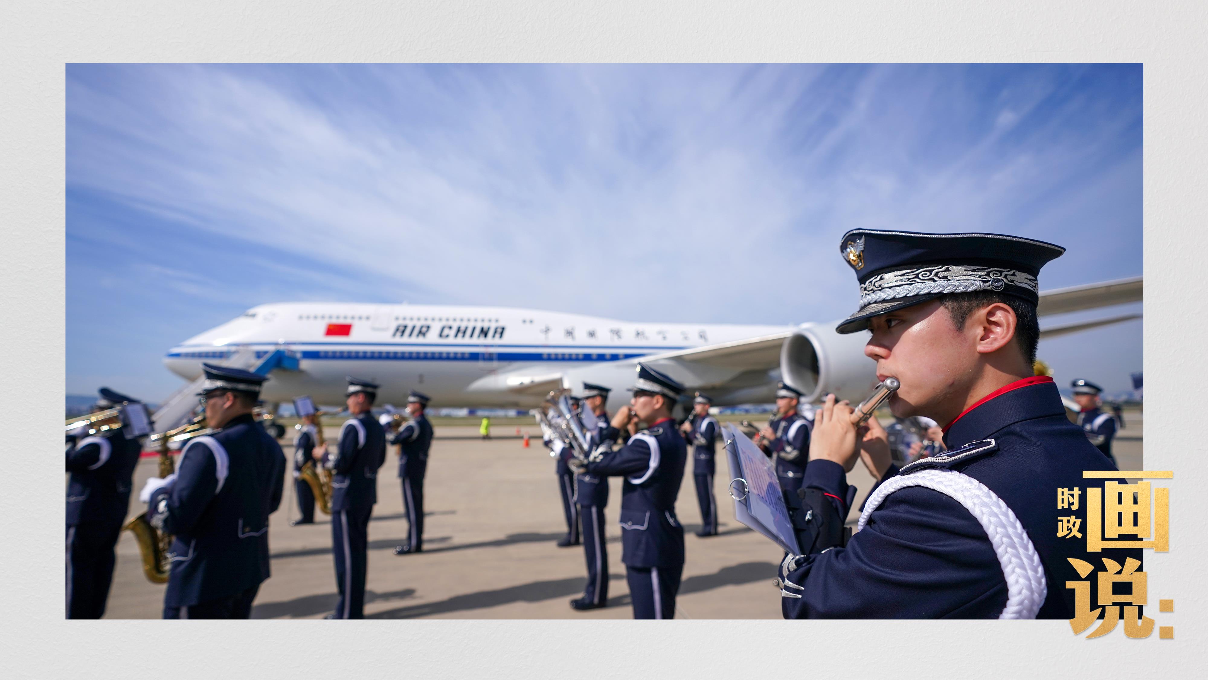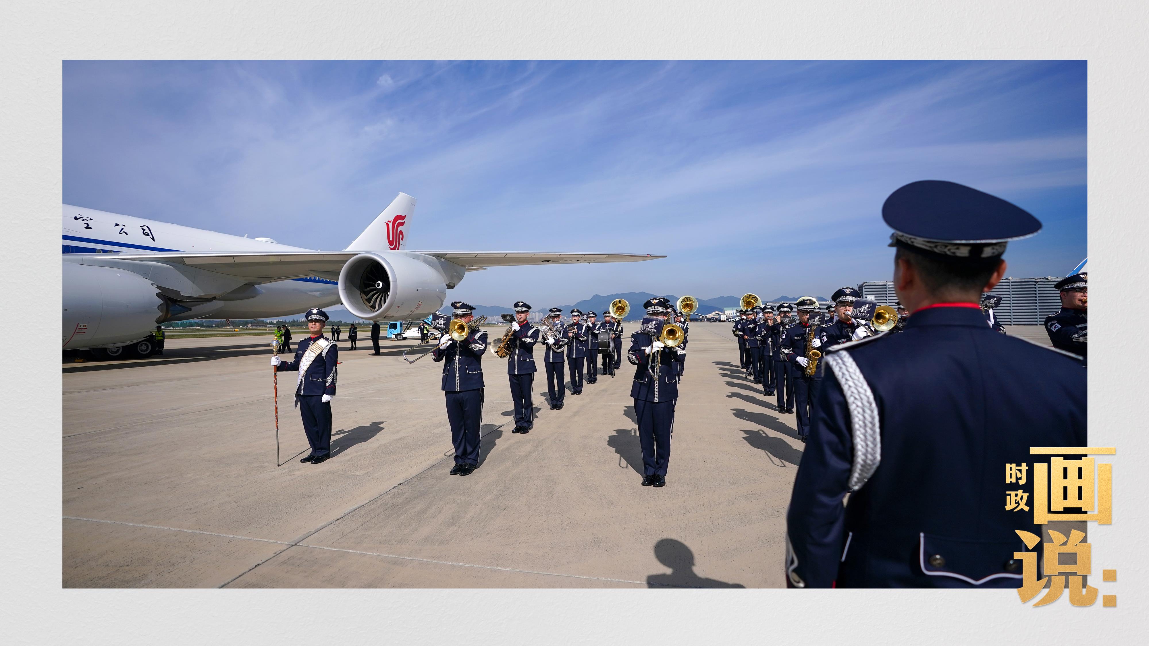 習近平抵達釜山金海國際機場時,韓國外長趙顯等高級官員熱情迎接。禮兵分列紅地毯兩側(cè)致敬,軍樂團演奏行進樂,機場鳴放21響禮炮。
