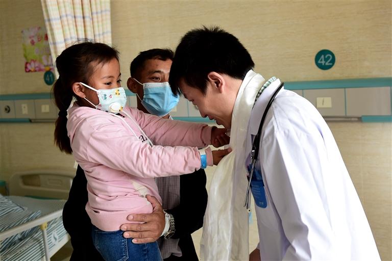 患兒(左一)在家長陪同下向主治醫(yī)師車轟獻(xiàn)哈達(dá)表示感謝。黃博涵 攝
