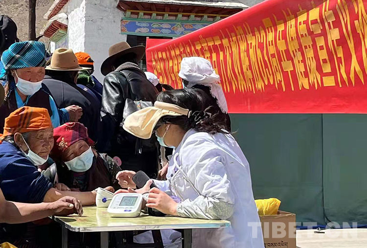 圖為西藏自治區(qū)4家自治區(qū)級醫(yī)院專家在拉薩市林周縣強嘎鄉(xiāng)為當?shù)厝罕娏x診