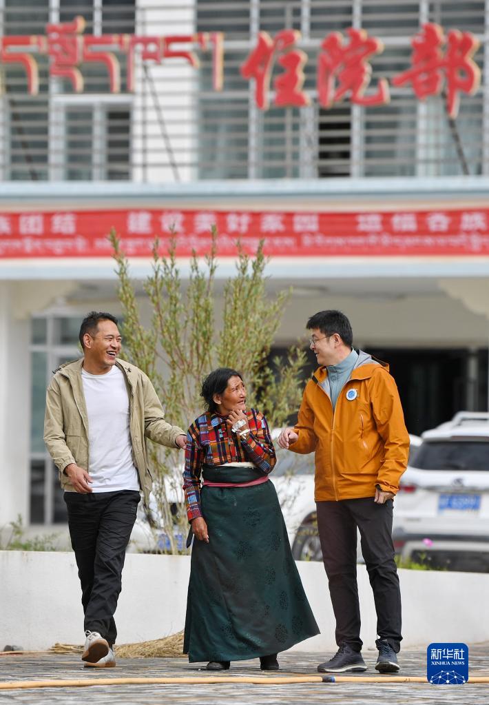 7月31日,在阿里地區(qū)人民醫(yī)院,中國醫(yī)學(xué)科學(xué)院整形外科醫(yī)院醫(yī)生王克明(右)和西藏自治區(qū)人民醫(yī)院醫(yī)生旦增念扎(左)陪伴即將做手術(shù)的牧民巴吉放松散步。新華社記者 張汝鋒 攝