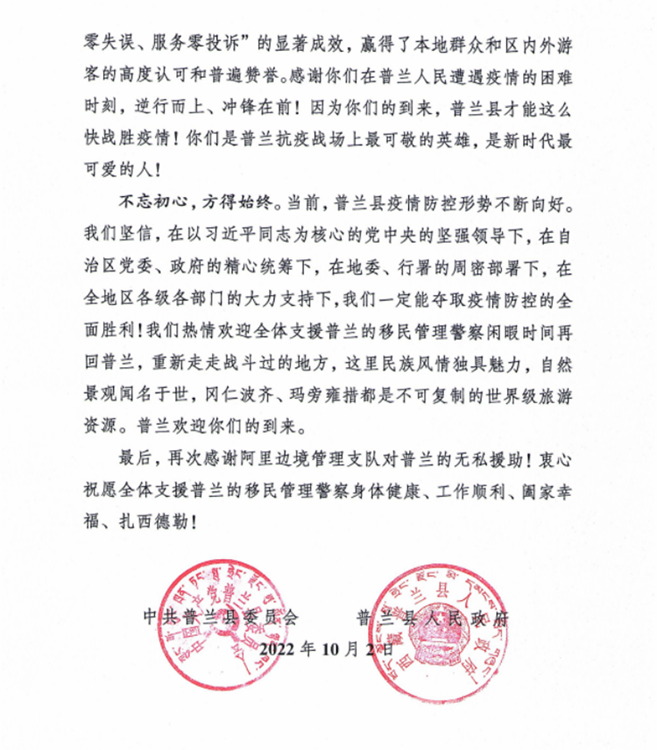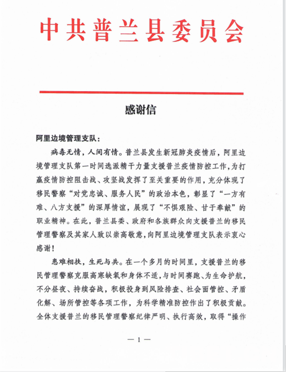 中國(guó)西藏網(wǎng)訊 “普蘭縣發(fā)生新冠肺炎疫情后,阿里邊境管理支隊(duì)第一時(shí)間選派精干力量支援普蘭疫情防控工作,為打贏疫情防控阻擊戰(zhàn)、攻堅(jiān)戰(zhàn)發(fā)揮了至關(guān)重要的作用?!?0月2日,西藏自治區(qū)阿里邊境管理支隊(duì)收到一封來(lái)自阿里地區(qū)普蘭縣委的感謝信。信中對(duì)阿里邊境管理支隊(duì)?wèi)?zhàn)“疫”一線民警在一個(gè)多月的疫情防控工作中,克服困難、勇于擔(dān)當(dāng)、不分晝夜、持續(xù)奮戰(zhàn)的抗疫工作表達(dá)了感謝,給予了肯定。