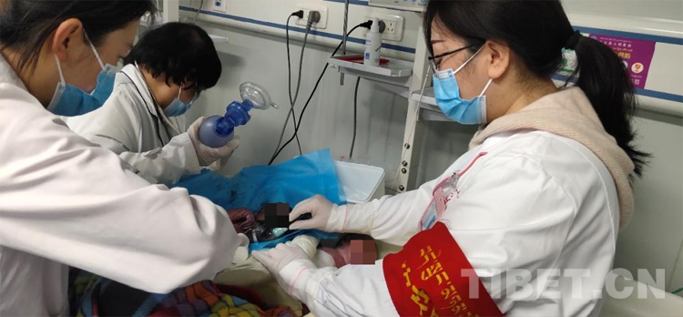 情況緊急,婦產(chǎn)科護(hù)士長(zhǎng)范雪娟向天津援藏醫(yī)療隊(duì)發(fā)出緊急搶救通知,援藏醫(yī)療隊(duì)醫(yī)務(wù)科科長(zhǎng)孫乃輝和急診科李欣芯護(hù)士長(zhǎng)迅速趕到,加入搶救隊(duì)伍。此時(shí)第二個(gè)女?huà)肭闆r仍無(wú)好轉(zhuǎn),更加危急,心率降至50次/分,新生兒復(fù)蘇成功的關(guān)鍵是在黃金一分鐘內(nèi)建立有效通氣,大家馬上全力協(xié)作,對(duì)患兒進(jìn)行復(fù)蘇氣囊正壓通氣及胸外按壓,經(jīng)治療患兒呼吸逐漸好轉(zhuǎn),臉色開(kāi)始變得紅潤(rùn),哭出了聲音,心率逐漸上升到120次/分。所有在場(chǎng)的醫(yī)生,終于深深地松了一口氣。