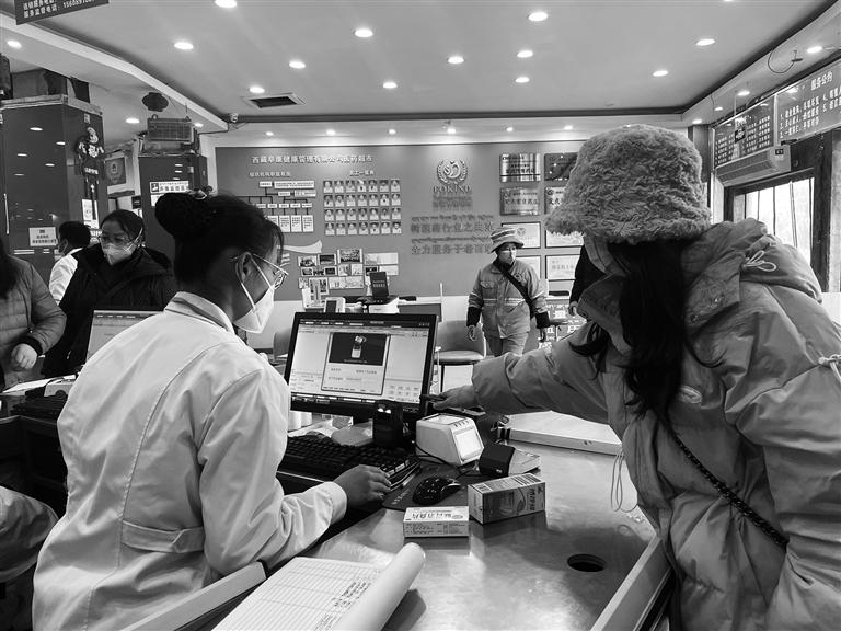 拉薩市民正在藥店使用醫(yī)??ㄙ?gòu)藥。