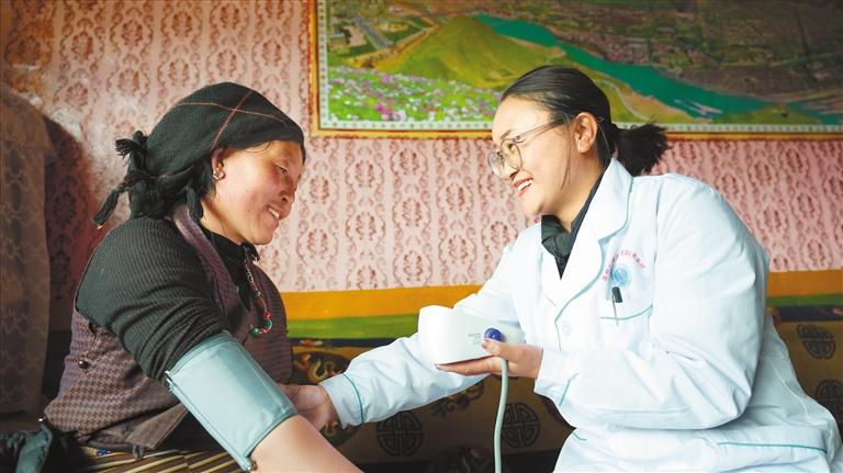圖為墨竹工卡縣尼瑪江熱鄉(xiāng)邦達村簽約家庭醫(yī)生為村民測量血壓。記者 唐斌 通訊員 洛克 攝