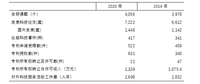 2020年全國中醫(yī)藥科研機構在研課題共4,056個,比2019年的3,978個增加了78個,增幅2.0%。發(fā)表科技論文7,222篇,其中國外發(fā)表1,448篇,出版科技著作417種。比2019年全國中醫(yī)藥科研機構發(fā)表的6,612篇科技論文增加了610篇,增幅為9.2%。
