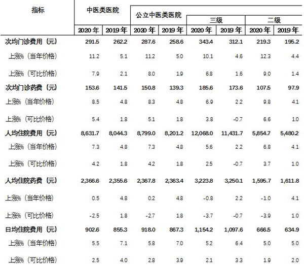2020年中醫(yī)類醫(yī)院病人醫(yī)藥費有何變化?《報告》顯示,2020年中醫(yī)類醫(yī)院次均門診費用291.5元,按當年價格比上年上漲11.2%,按可比價格上漲7.9%;人均住院費用8,631.7元,按當年價格比上年上漲7.3%,按可比價格上漲4.2%。日均住院費用902.6元。
