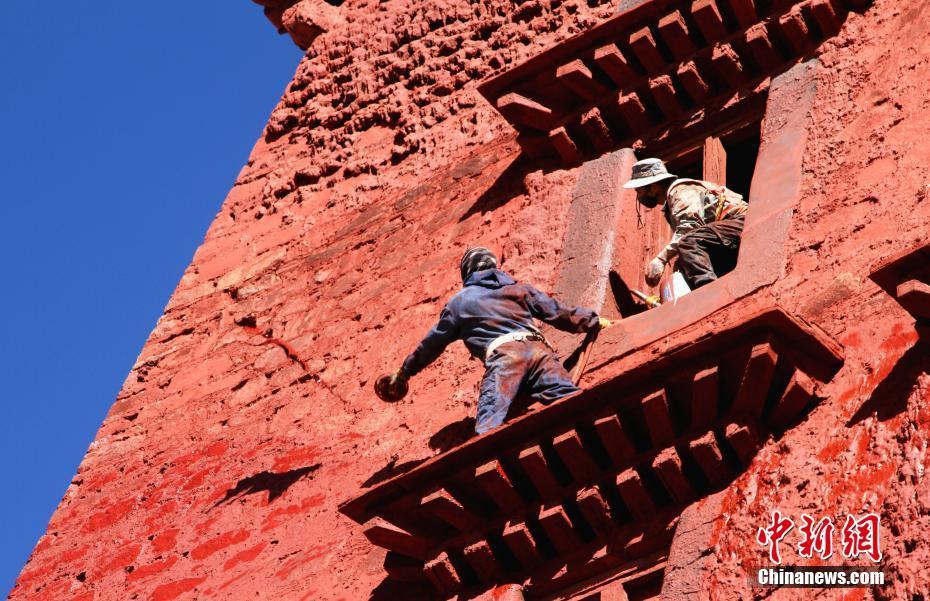 布達拉宮管理處維修科工作人員開始對紅宮進行粉刷。中新社記者 趙延 攝